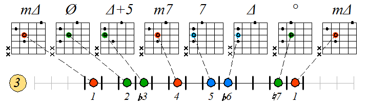 Игра гаммы мелодического минора септаккордами с движением тонических нот по 3 струне: