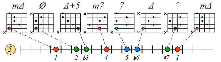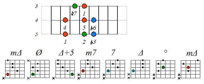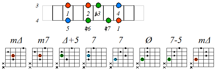 Игра гаммы мелодического минора септаккордами с движением нижних тонических нот по 5 струне: