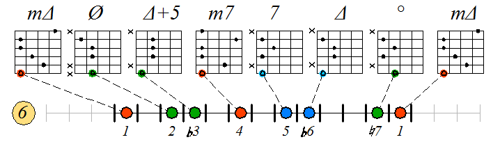 Игра гаммы мелодического минора септаккордами с движением нижних тонических нот по 6 струне: