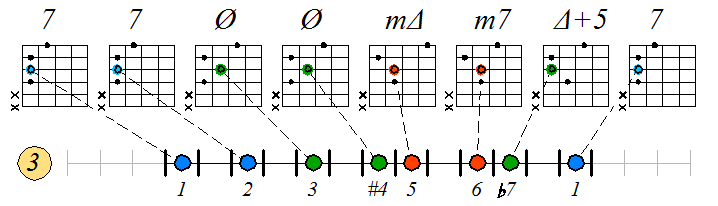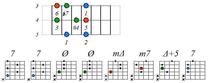 Игра гаммы лидийско-миксолидийского мажора септаккордами с движением тонических нот по 3 струне: