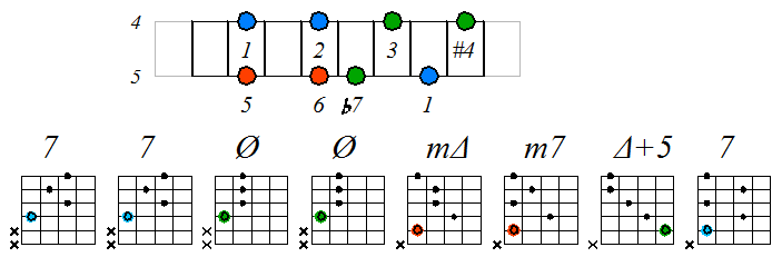 Игра гаммы лидийско-миксолидийского мажора септаккордами с движением тонических нот по 4 струне с переходом на 5: