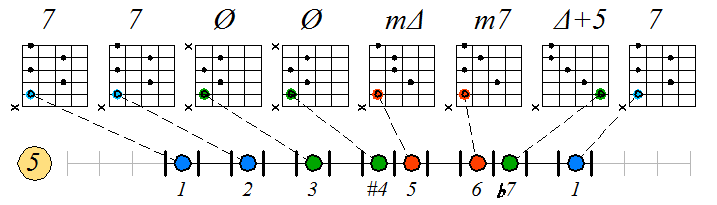 Игра гаммы лидийско-миксолидийского мажора септаккордами с движением нижних тонических нот по 5 струне: