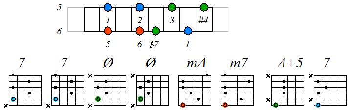 Игра гаммы лидийско-миксолидийского мажора септаккордами с движением тонических нот по 5 струне с переходом на 4 и 3 (альтернативная аппликатура гаммы):