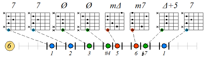 Игра гаммы лидийско-миксолидийского мажора септаккордами с движением нижних тонических нот по 6 струне: