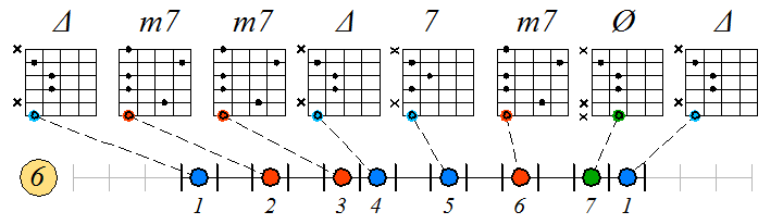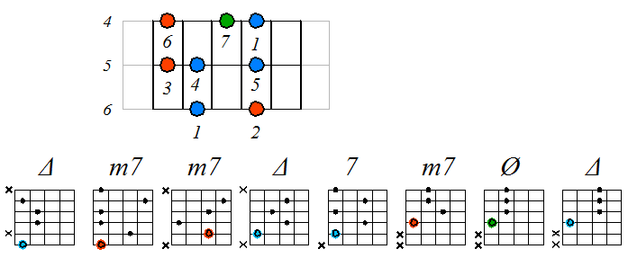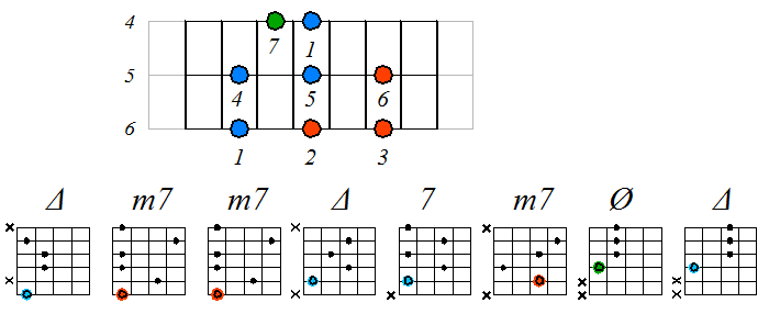 Ниже приведен пример игры натурального мажора септаккордами с движением нижних тонических нот по 6-ой струне с переходом на 5-ую и 4-ую. Для игры по этой схеме нужно хорошо представлять аппликатуру натурального мажора по схеме 3 ноты на струне. В принципе, переходить на 4-ую струну не обязательно, а можно продолжить игру на пятой струне, однако, находясь в высокой части грифа (за 12-ым ладом), бывает удобней взять аккорд с тоникой на 4-ой, а не на 5-ой струне.