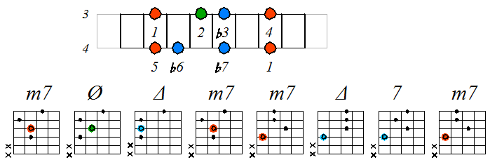 Игра гаммы дорийско-фригийского минора септаккордами с движением тонических нот по 3 струне с переходом на 4: