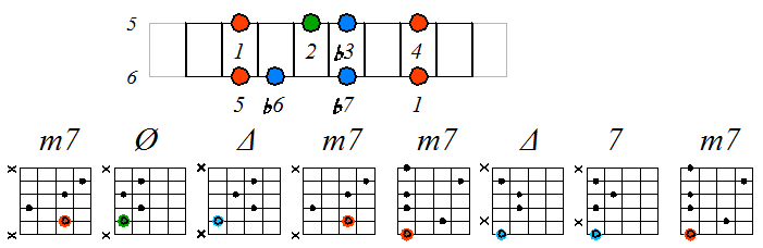 Игра гаммы дорийско-фригийского минора септаккордами с движением тонических нот по 6 струне с переходом на 5 и 4: