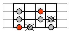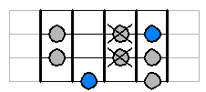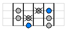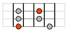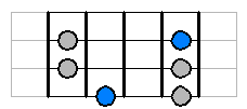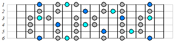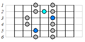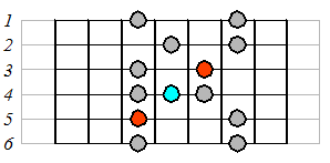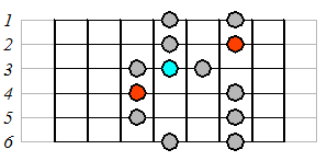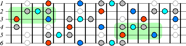Блюзовая нота - это вводный тон ко второй или третей ступени в мажорной пентатонике (или к четвертой или пятой в минорной). В аппликатурах для игры в одной позиции на всех шести струнах, в том числе и в боксах, наибольший интерес представляют те участки аппликатуры, в которых блюзовая нота оказывается на одной струне с соседними ступенями. Тогда эти три ноты играются пальцовкой 1-2-3: