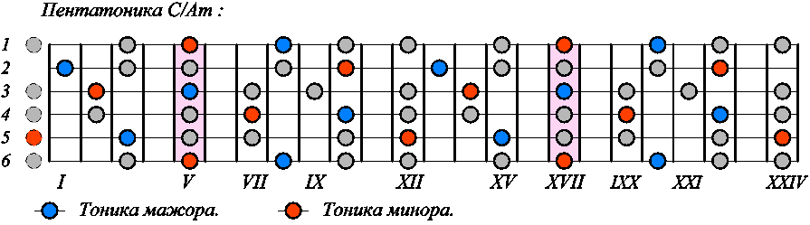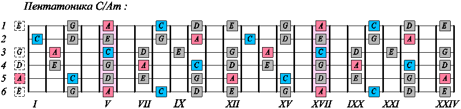 А начинать изучение пентатоники на практике лучше все-таки в тональности C-мажор и параллельной ей Am-минор. Для этого вышеприведенные схемы необходимо просто перенести в нужную позицию: