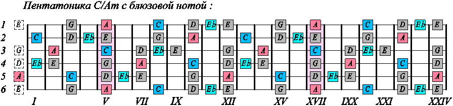 Все ноты пентатоники C/Am с блюзовой нотой: