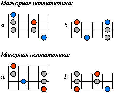 Ниже приведены по 2-е аппликатуры мажорной и минорной пентатоник на грифе гитары (данные аппликатурные формы не учитывают смещение на 1/2 тона на верхних струнах, т.е. на 1-ой и 2-ой) для игры в одной позиции: