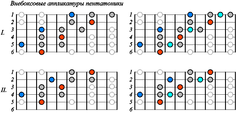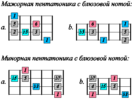 Приведем аппликатуры мажорной и минорной пентатоник в каждой октавной позиции (схемы сразу с блюзовой нотой):