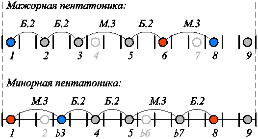 Таким образом, мы имеем следующие формулы мажорной и минорной пентатоник: