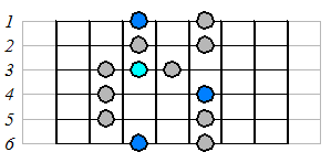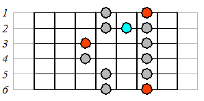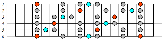 Обратите внимание на положение тоники параллельной мажорной пентатоники в минорной - здесь учень удобно, пользуясь системой октав, проецировать на гриф совмещенную аппликатуру параллельных пентатоник. Не смотря на то, что пентатоника - достаточно простая гамма, в которой в пределах октавы всего пять нот, данная совмещенная схема помогает лучше ориентироваться на грифе:
