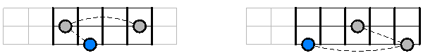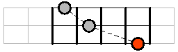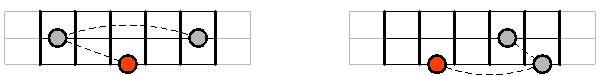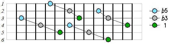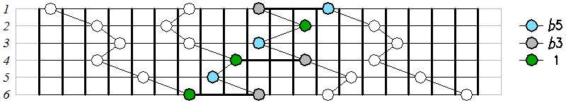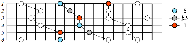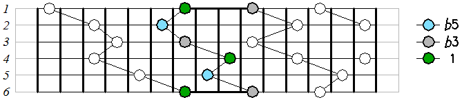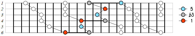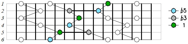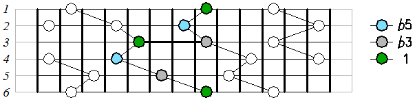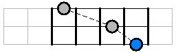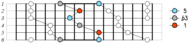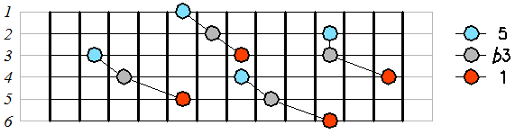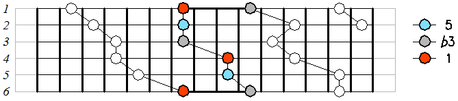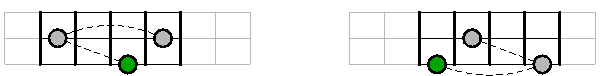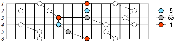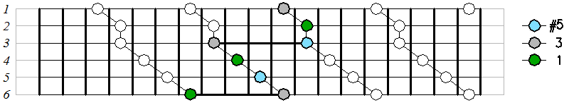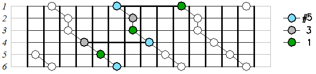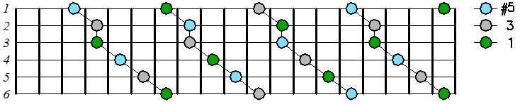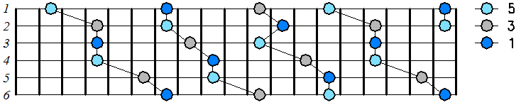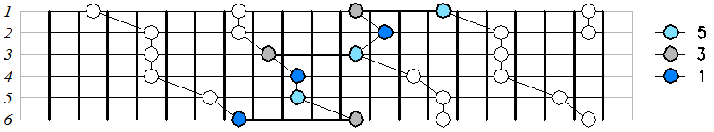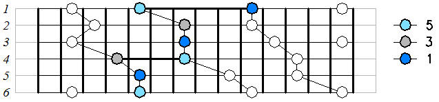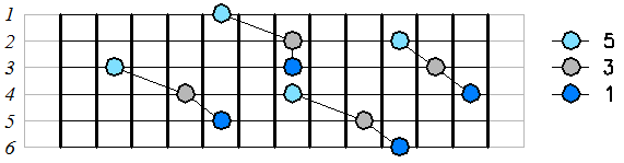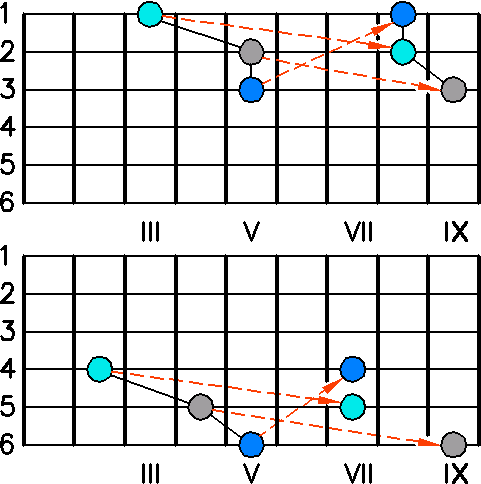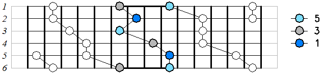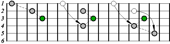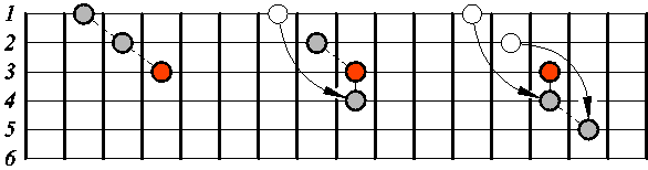 Кроме того, смещать аппликатуры можно и не задерживаясь в рамках одной октавной позиции. Один из примеров мажорного трезвучия: