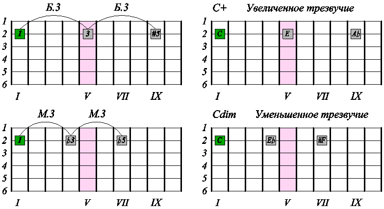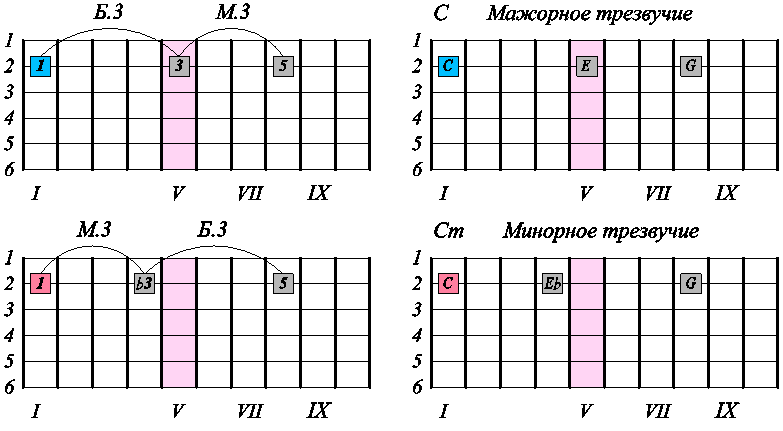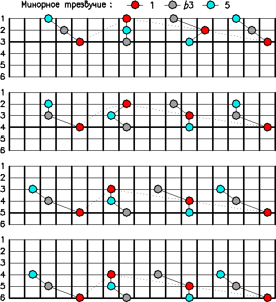 На практике чаще трезвучия строят на трех струнах, т.е. одна ступень - одна струна. Ниже приведены аппликатуры всех 4-х типов трезвучий с тоникой на 6-ой, 5-ой, 4-ой и 3-ей струнах: