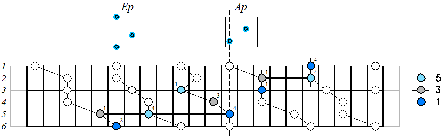 Играть трезвучия по выше приведенным схемам не всегда удобно с точки зрения аппликатуры. На практике часто используют смещенные схемы. Один из приемов - это игра в рамках октавной позиции. Рассмотрим, как можно заполнить обращениями трезвучий каждую октавную позицию. Октавная позиция Ep: