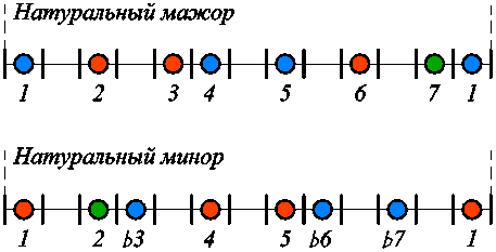 Таким образом, мы получили схему натурального мажорного лада (и, соответственно, параллельного ему натурального минорного) из которой видно, какие ступени в ладу "минорные", а какие "мажорные" (седьмая ступень в мажоре и она же вторая в миноре исключение, как показано выше, от нее строится уменьшенное трезвучие).